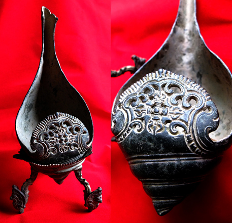 Description: The ritual conches; Sankha, they were used either as ladles to dip and pour libation of holy water or as wind instruments to produce the sacred sound "Om". It is decorated with a miniature refief of the Mahayana Buddhist symbole, Vishvavajra. Vishvavajra, the crossed Vajra, (vishwa or vishva is Sanskrit for world with the connotation of "the universe as we experience it".) it stands for the stability or foundation of the physical world. It is the emblem of Amoghshiddhi, the fifth Dhyani Buddha whose influence encourages immoveable determination.