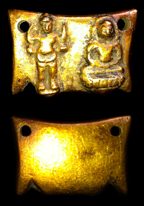 Description: The Buddha is sitting on the lotus throne and the Bodisattva Lokeshvara is standing on the left. The Lokeshvara wears Sampot, which downturned upper edge hides part of the belt in front, is entirely pleated. This gold Buddha, its shape looks like mask-shape in agate beads in Dvaravati culture and can be dated in the end of Dvaravati art in 10th - 12th century.