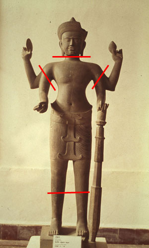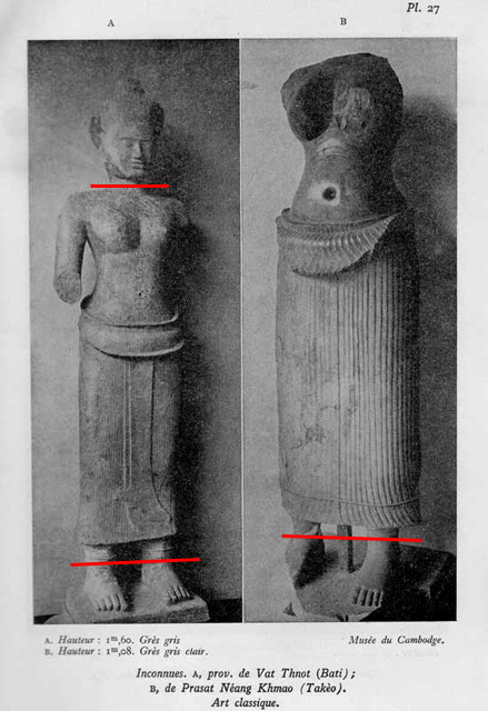 And old photo testifies the condition in which these statues were found in the corridors of the Khmer temples and how they are now produced for the market (red lines).