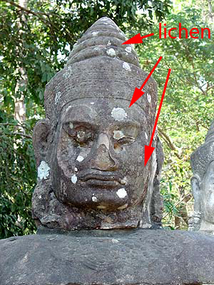 2. The composition of the accretions on the surface reflects the sculpture's history and its environment. Accretions commonly found on Cambodian sculpture include paint, soil (clay, sand), root fragments, and deposits left by mold and lichen (microbiological remains). It is likely that parts of many statues were originally painted. Not surprisingly, paint did not survive well on Cambodian sandstone sculpture. However, some objects still retain traces of paint, including the ground applied to the stone surface before the object could be painted. Much of the soil deposits cannot be considered to be indicative of age or authenticity, except when they contain evidence of long-term natural processes. An example is the presence of root marks. The presence of roots itself indicates a prolonged exposure either on or in the ground, but it does not necessarily indicate authenticity of the object. However, roots often become lodged in surface deposits or become encapsulated. When the roots decompose, they leave only their impressions in the accretions. The presence of root impressions or root pseudomorphs is considered the result of a long-term process and supports authenticity.