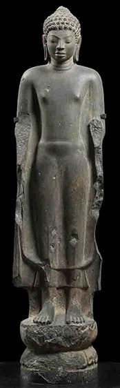 The Buddha images which are considered to be Dvaravati art but still strictly followed the form and style of Indian art are the genre of standing Buddha images wearing thin transparent robes covering both shoulders. The robe covers the whole body and the hem of the robe is curvy at the ankle. The standing Buddha images are usually in the attitude of blessing, i.e. the right arms stretching along the body showing palm and the left hand holding the robe at chest height. These are the typical Gupta style. There are Buddha images, which are contemporary to those of Central Java and Pre-Angkor style.